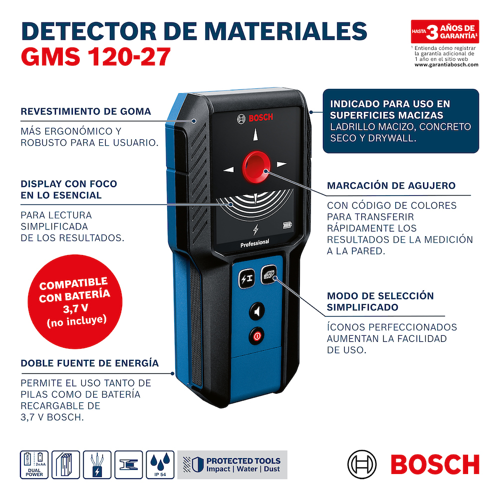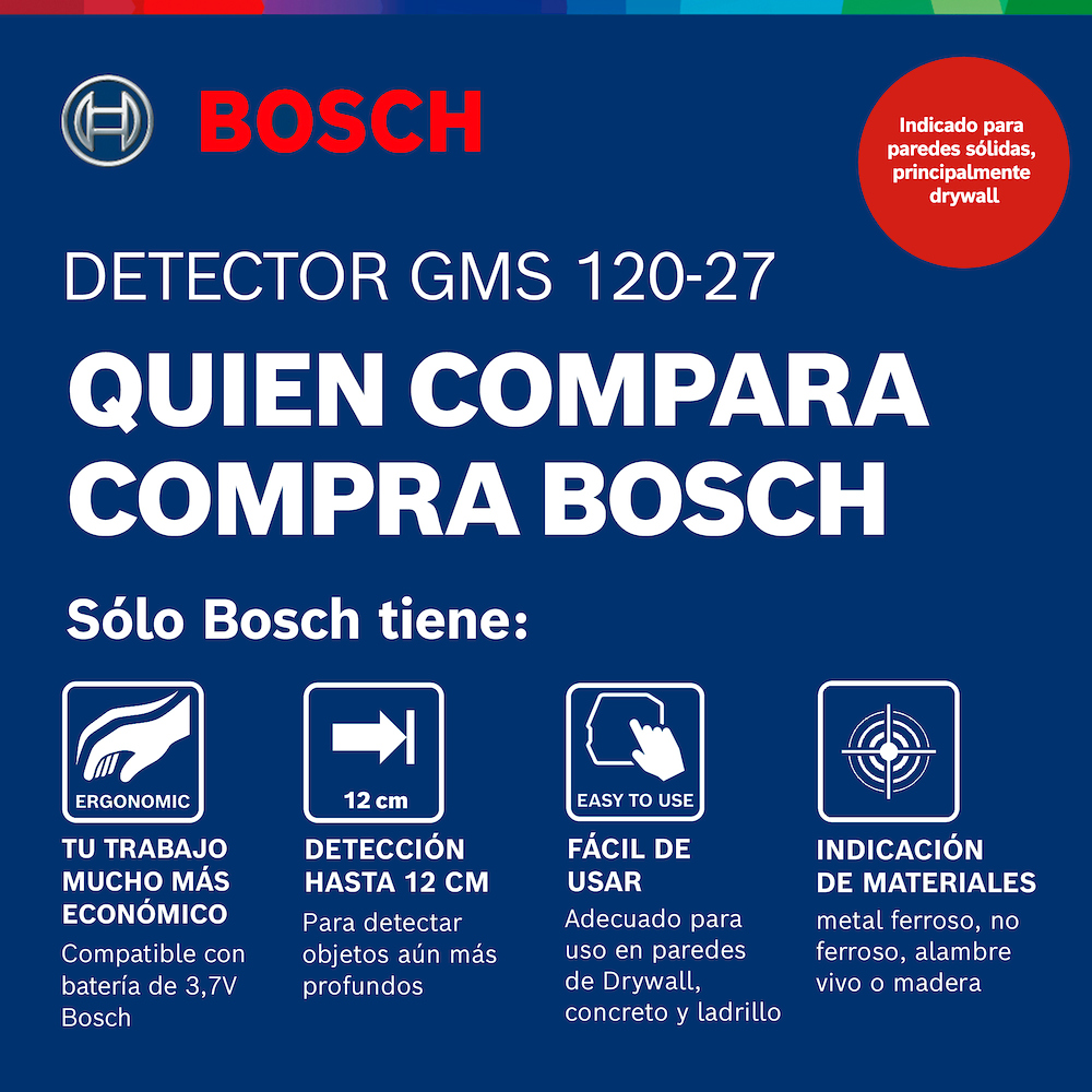El detector de materiales Bosch GMS 120-27 es ideal para la detección de diferentes materiales en paredes de Drywall, como metales, cables energizados y madera. ¡Conoce más!
